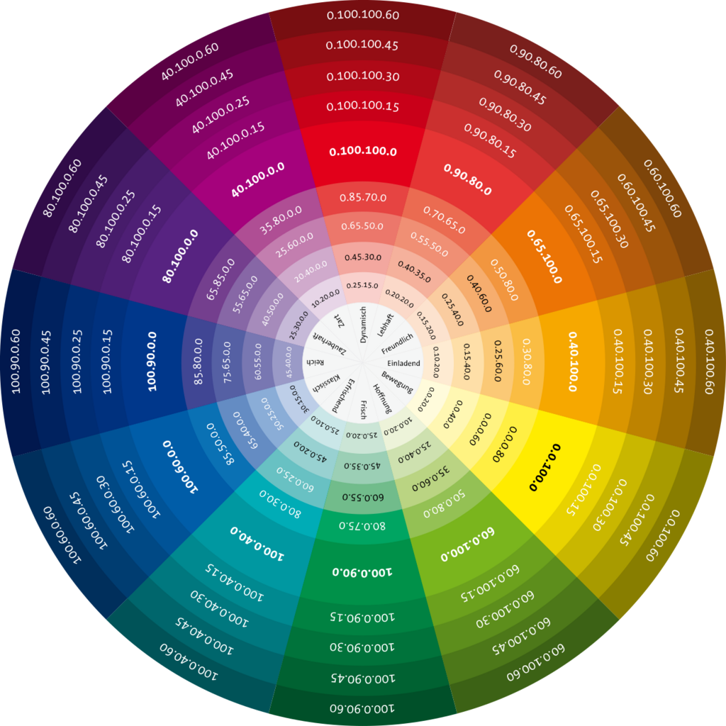 Farbkreis mit Angabe von Stimmungen. Gegenüberliegend befindet sich die jeweilige Komplementärfarbe.